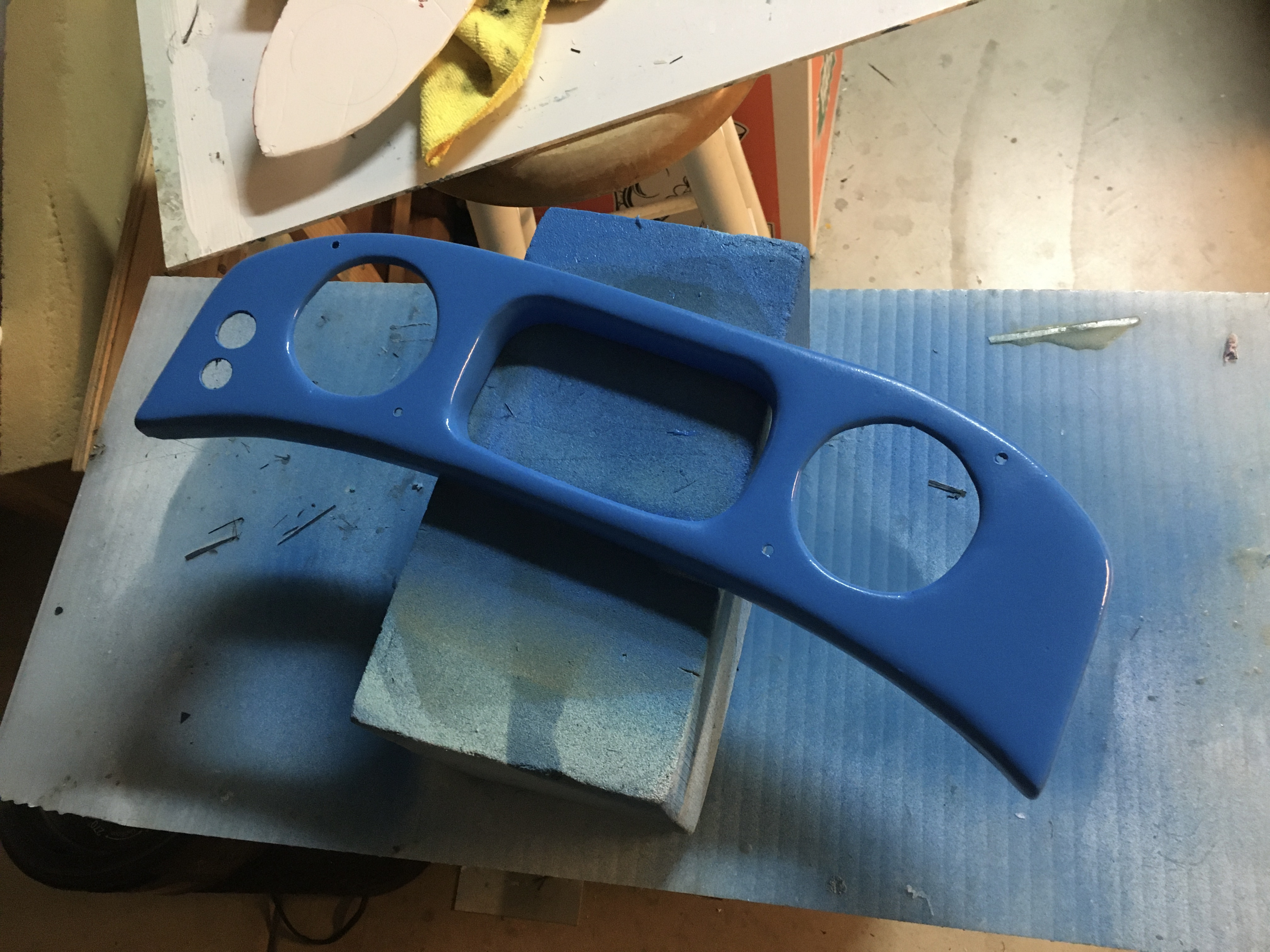 Below you see the plug on the left, made from 1″ pink foam sheet, bondo and paint. The resulting mold is on the right. I should have made a 2-part mold. Extracting the plug and then the part from the mold was very difficult.