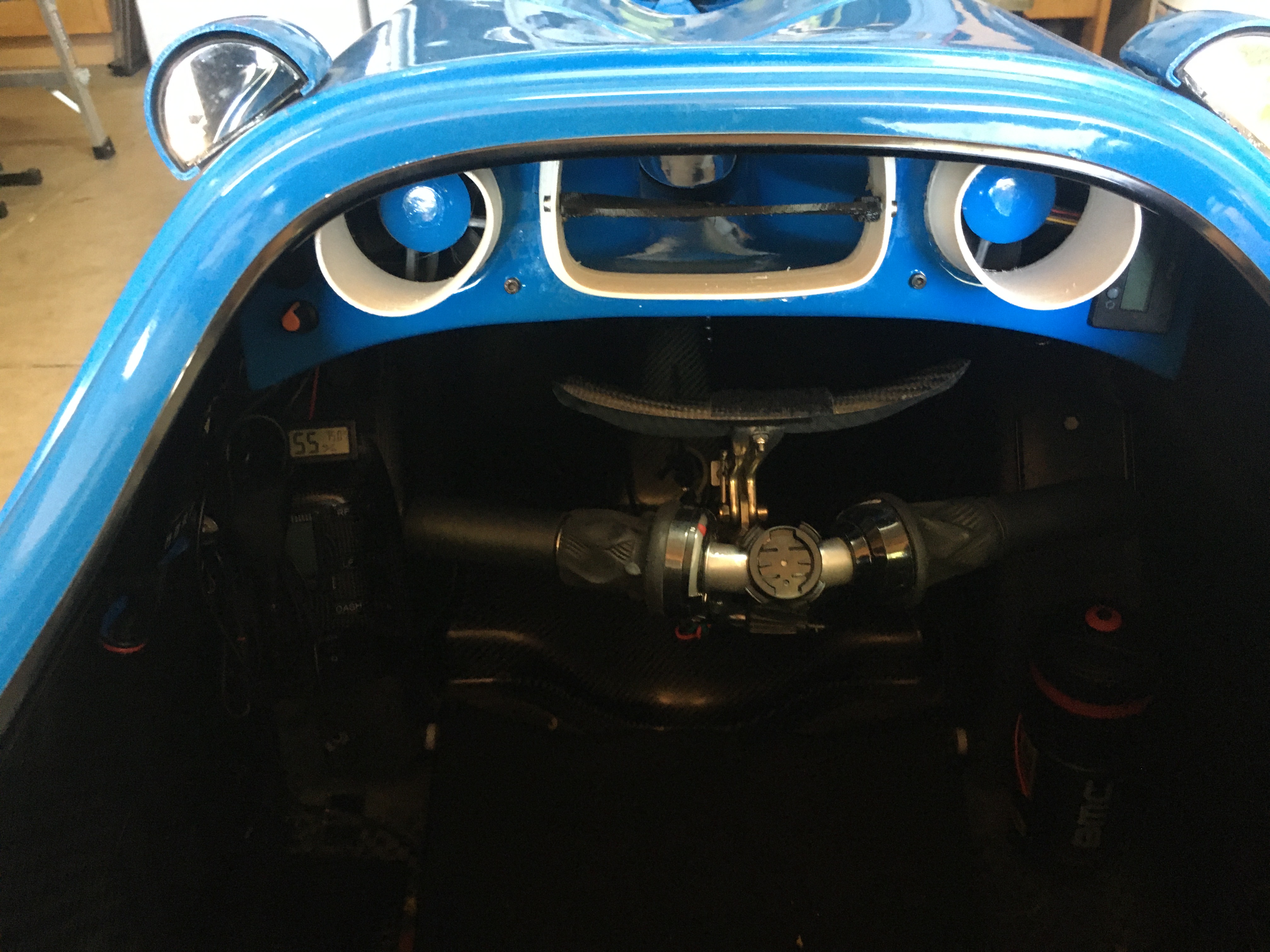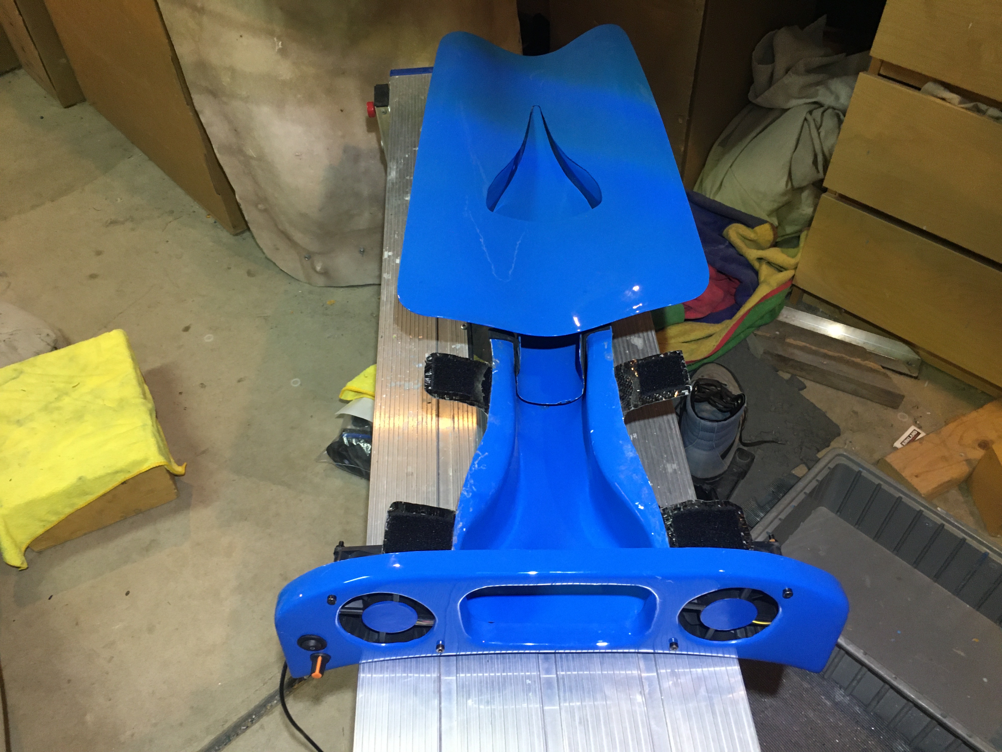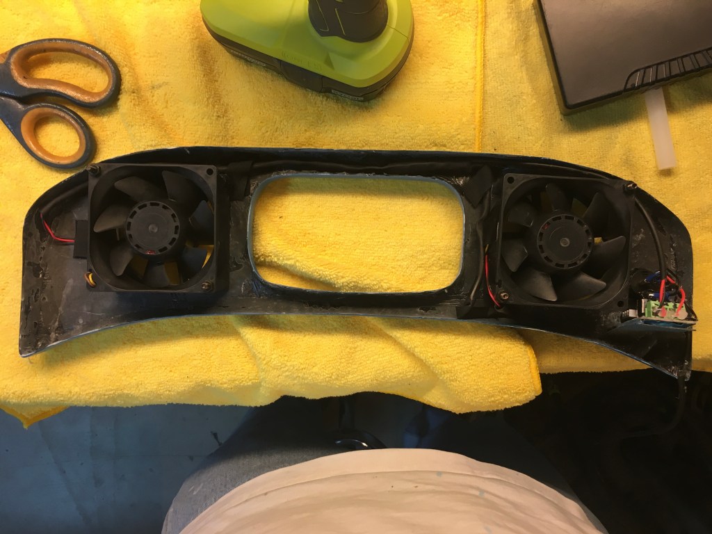 I’ve been playing with various configurations of NACA ducts, extension ducts and electric fans on the DF to add a bit of airflow through the cockpit. The more that I tinkered, the more complicated the cockpit got. So I decided to try to organize the cooling and sort of wrap it all up in a dashboard. The idea was to provide a single piece that surrounded the vent from the NACA duct, incorporated the fans and organized the fan and switching wiring. Here’s what I came up with…