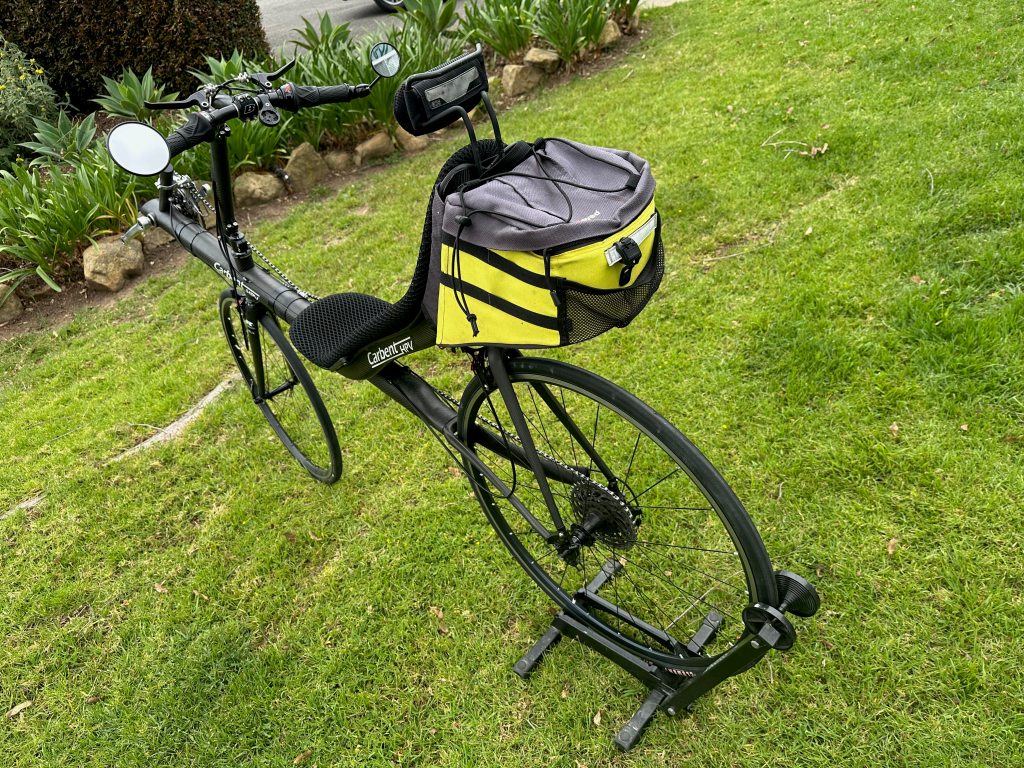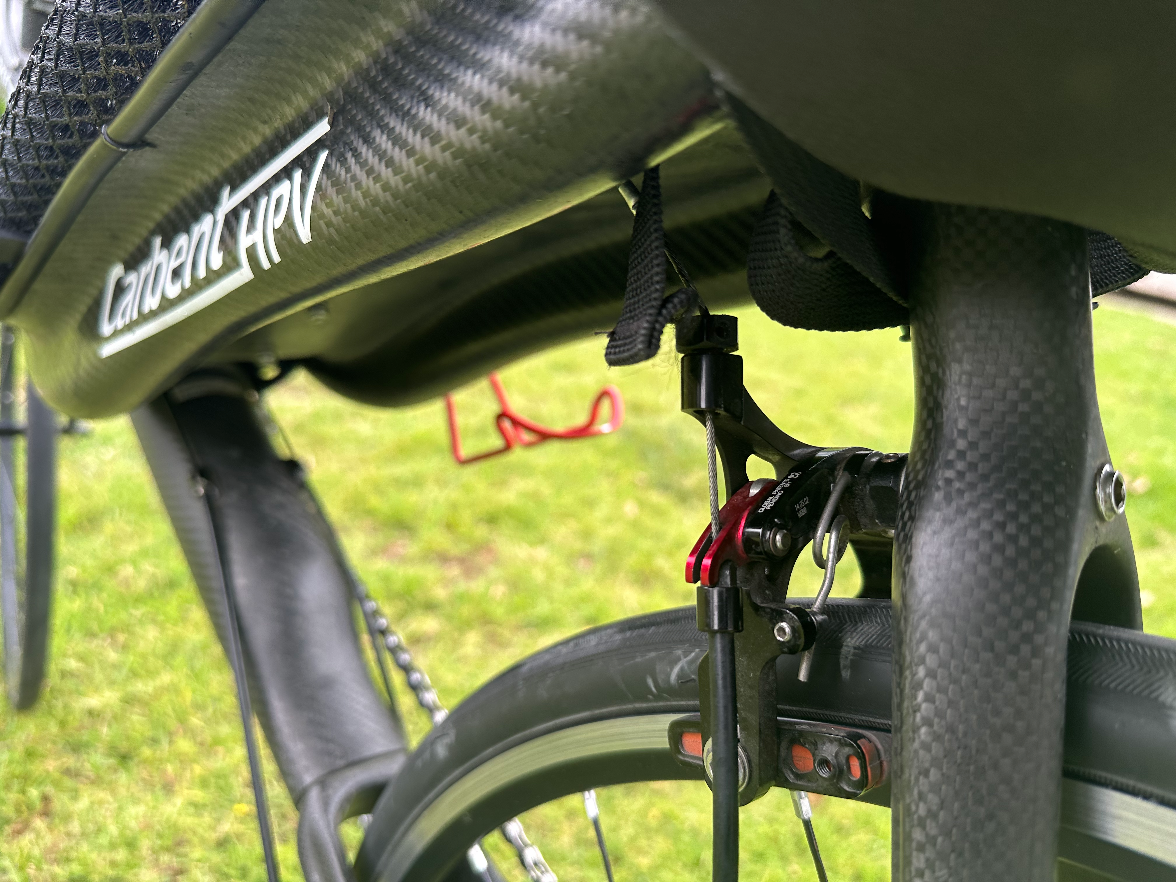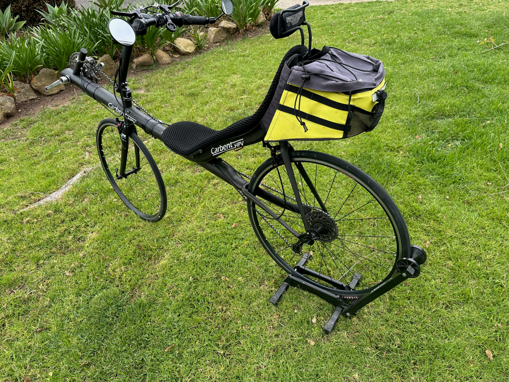 Up for sale is this very rare Carbent recumbent bike. This bike features an all carbon fiber frame, seat and fork. The fixed seat and seat stays minimizes any flex in the frame, making it an excellent handling bike. Adjustment for leg length is accomplished with a telescoping boom. This bike is unusual in that it was designed for a smaller 650c front wheel with a 700c rear wheel. It is in excellent condition appearing to be a very low mileage bike.