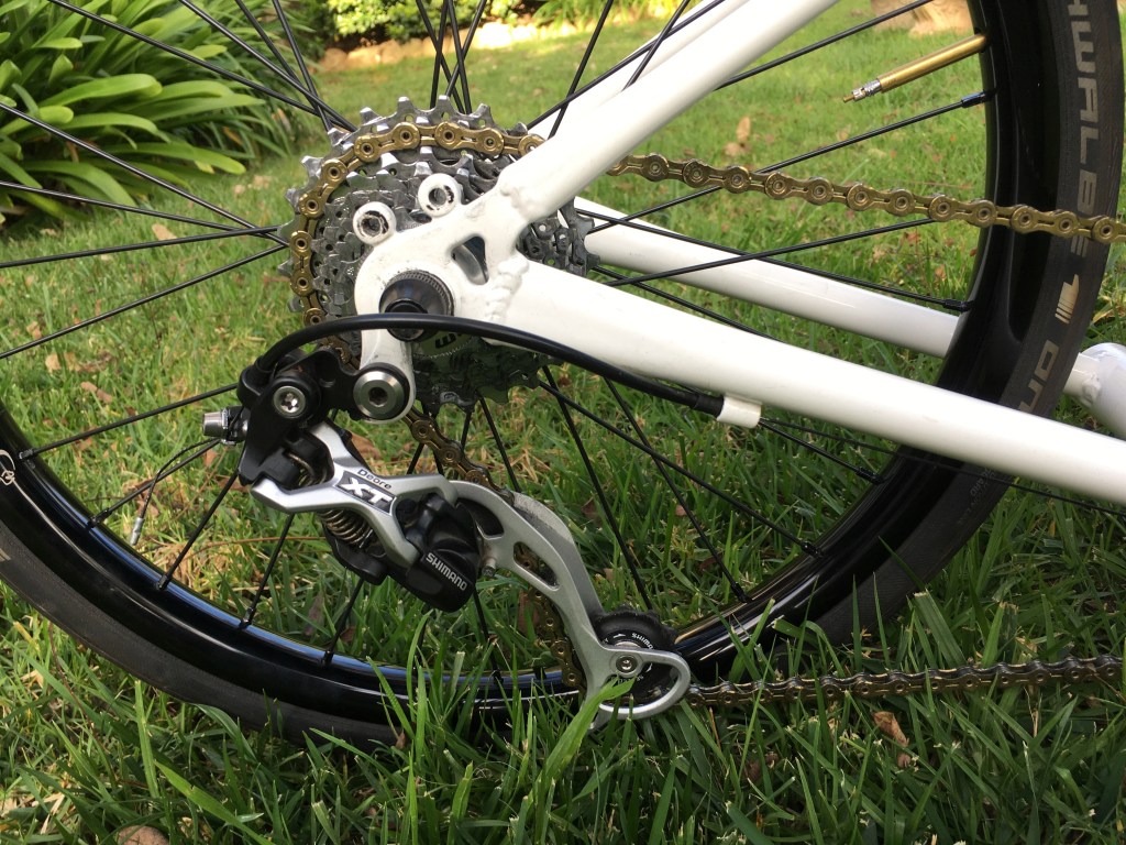 - Rear derailleur is Shimano Deore XT 9 speed mid-cage.