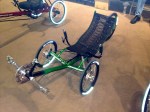 I made the trip down to the Recumbent Cycle Con in Pomona today. I had a chance to check out the new Greenspeed prototype and have a chance with Ian Sims. This is a very interesting trike. To me it looks like an updated version of the old GLR. It has the new curvier seat and aero tubing on the cross members of the cruciform. It also has negatively cambered front wheels like the X-series and the SLR. Unlike the GLR, it has the steering above the frame. Ian says that this is just a prototype and that the production version will have disc wheels and perhaps a hard shell seat option. He expects it to be available next year.