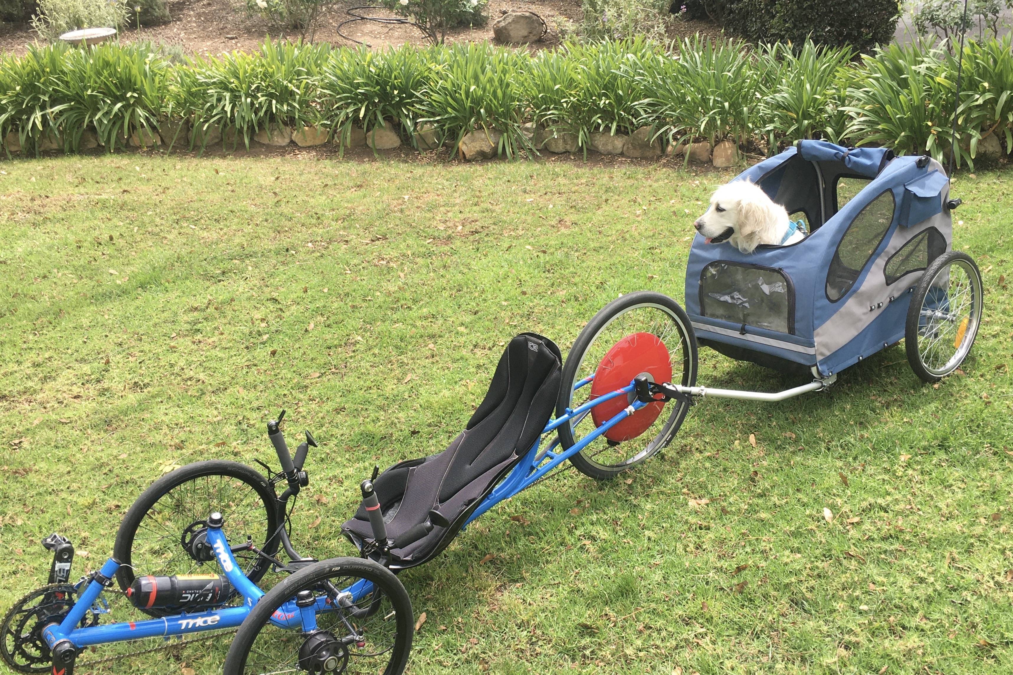 The Special has been sitting dormant while my wife is resting her bad neck. So, I’ve reconfigured it to my specs and installed a Copenhagen wheel (provided by my friend Dawn). Now it’s Lulu’s dog trailer hauler.